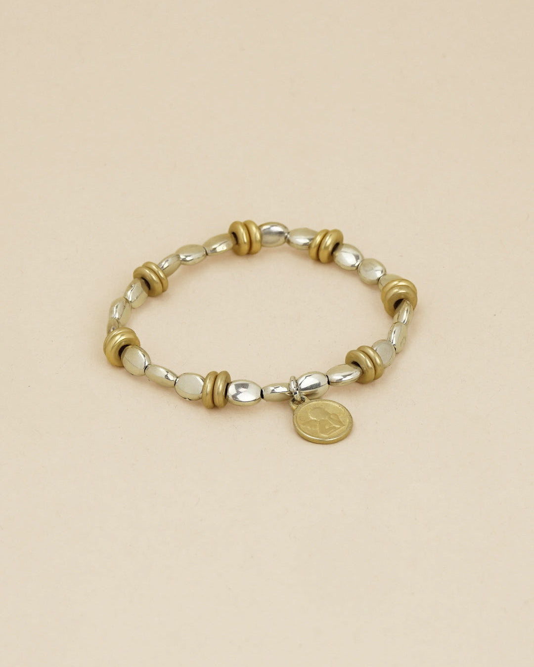 Il bracciale Isi unisce perle metalliche dalla forma unica e delicati accenti dorati o color champagne, impreziositi da un ciondolo a forma di medaglione rotondo a forma di angelo, simbolo di luce interiore e protezione . La sua texture irregolare gli conferisce un'eleganza calda e naturale .