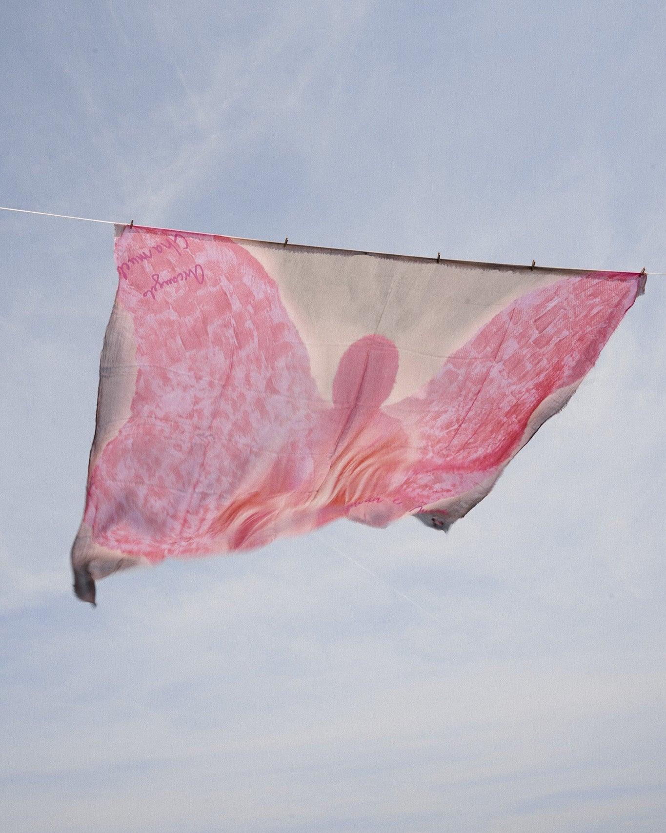 Con i suoi radiosi toni rosa, lo scialle Arcangelo Chamuel incarna l' energia dell'amore, della compassione e dell'armonia . La figura angelica dalle ampie ali diventa simbolo di protezione e forza interiore, mentre il tessuto rimane leggero, morbido e versatile: un compagno per ogni stagione .