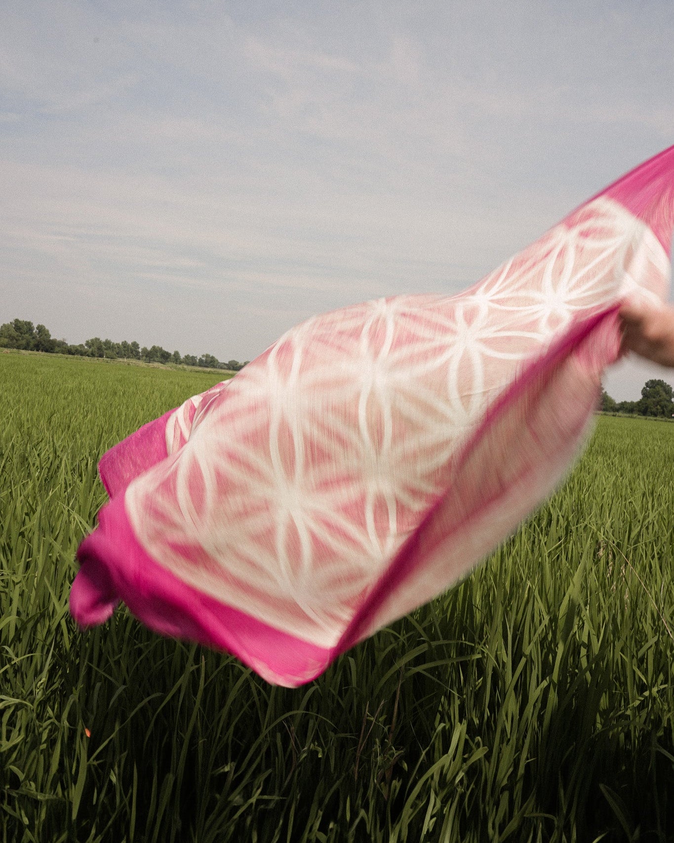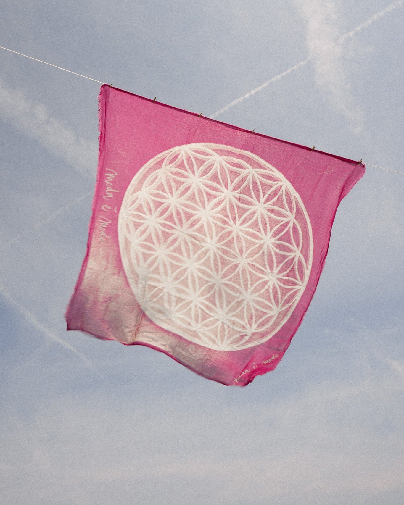 The Flower of Life, a sacred symbol of harmony and universal connection, is reinterpreted in vibrant fuxia – a color of energy, passion, and creativity. The bold geometry meets an intense hue, creating a piece that carries both ancient wisdom and contemporary vitality.
